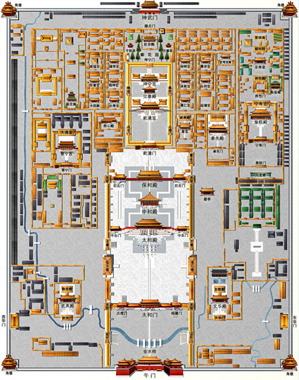 外朝以太和殿、中和殿、保和殿三大殿為中心,位于整座皇宮的中軸線,其中三大殿中的“太和殿”俗稱“金鑾殿”,是皇帝舉行朝會(huì)的地方,也稱為“前朝”。是封建皇帝行使權(quán)力、舉行盛典的地方。此外兩翼東有文華殿、文淵閣、上駟院、南三所;西有武英殿、內(nèi)務(wù)府等建筑。