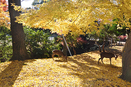 奈良公園神鹿公園地5.25平方公里,東西長約四公里,南北寬約兩公里,范圍之大,堪稱世界上數(shù)一數(shù)二的大公園。奈良的所有名勝古都在這座公園范圍內(nèi)。公園內(nèi)巨樹叢立,還有史悠久的古、花草、山林及巖石等;另有馴鹿成群,共有1,200多,散于山間、林下或寺廟的池畔,是奈良觀光的象徵。
