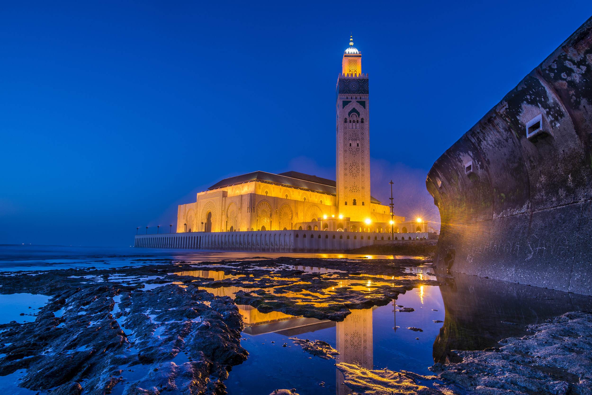 其中三分之一面積建在海上,以紀念摩洛哥的阿拉伯人祖先自海上來。整個清真寺可同時容納10萬人祈禱,是世界第三大清真寺,排在沙特阿拉伯的麥加和麥地那清真寺之后。