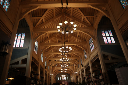 走進(jìn)內(nèi)部,可以看到里面修繕十分用心,保留了很多古舊的石雕建筑材料。家具也都是古董物件,一切都很和諧雅致。西洋氣質(zhì)依然濃郁,高聳的穹頂彩繪的玻璃窗,整齊精致的吊燈,書架全部貼著墻面設(shè)立,保證了中央處寬敞,整體效果很驚艷啊。中央可以仰望穹頂?shù)奈恢脫?jù)說原來是洗禮池,現(xiàn)在鋪成了木質(zhì)舞臺(tái)。