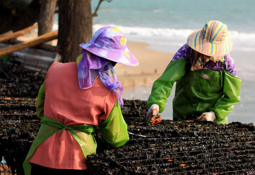 收菜:從養(yǎng)殖區(qū)把紫菜卷成捆,運(yùn)載到碼頭用起吊機(jī)吊到岸上。剪菜:工人攤開紫菜用剪刀裁剪,下面有張開的網(wǎng)兜住。洗菜:用特制的機(jī)器加淡水轉(zhuǎn)滾,洗去鹽分,再用脫水機(jī)甩干紫菜。曬菜:將甩干的紫菜放入圓形模具,曬干后就是市面上看到的成品紫菜啦。裝菜:一市斤裝一袋。