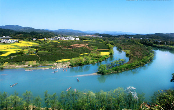 婺源月亮灣因江中有一江心洲如一輪眉月而得名,它依山伴水,水面平靜如鏡。春日周邊田野大地金燦燦的油菜花、綠菌菌的茶葉、古樸的民居點綴得絢麗多姿,使之呈現出一幅中國古代水墨山水畫。放眼望去一灣湖水如彎月,一彎黃綠的月亮靜臥水面,袖珍的小島,翠綠的湖水,靜謐流淌。籠罩在晨霧中的山巒跌宕起伏,山下黛瓦白墻組成的古村落在裊裊炊煙中顯得那么親切。青苗與黃色的油菜花交織在一起,山巒與彎曲的大河輝映在一起,村莊與大樹擁抱在一起。
