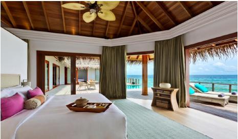 配備泳池的兩間臥室的海洋亭提供優(yōu)雅的住宿環(huán)境和極端隱私、慷慨的居住面積,它擁有更大的私人游泳池,以及室內、室外的餐飲設施。從甲板上寬大的休息空間通過樓梯可以直接下到海洋中,您還可以在自己的用餐區(qū)從您的私人酒柜拿出一瓶香檳盡情享用。