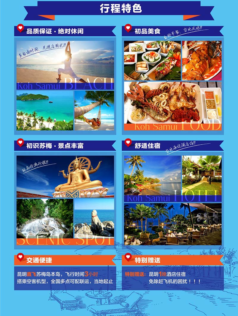 住宿---昆明1晚準(zhǔn)三酒店,蘇梅島5晚當(dāng)?shù)?星酒店標(biāo)準(zhǔn)間住宿,含酒店內(nèi)早餐。